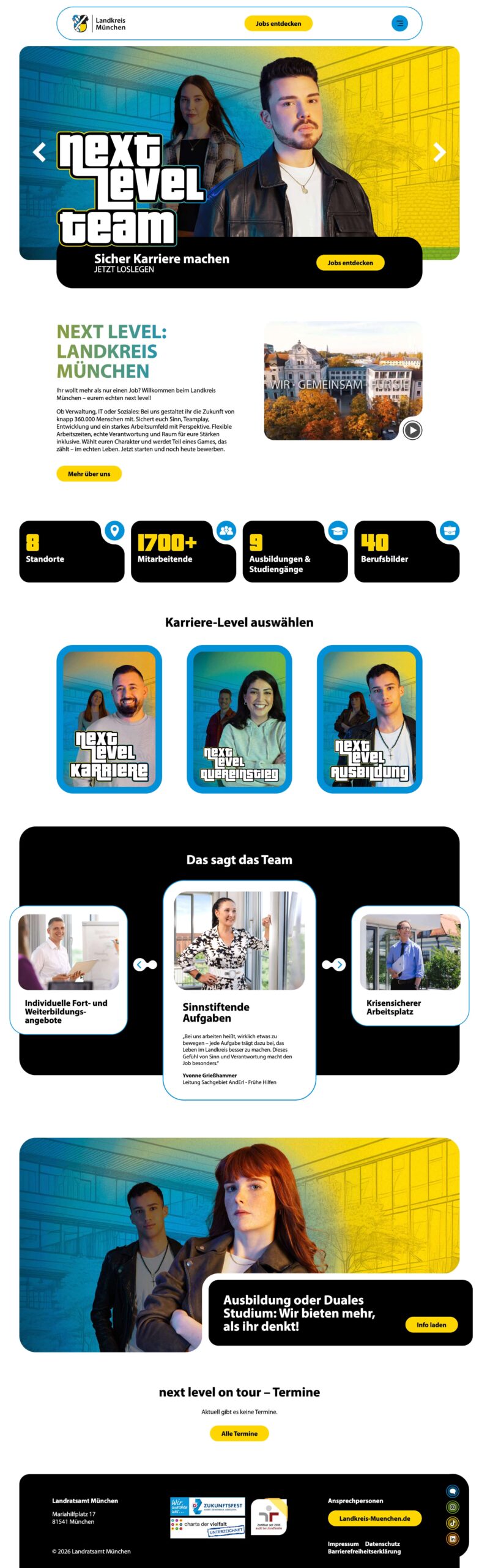 Mit karriere.landkreis-muenchen.de entwickelten wir ein interaktives Karriereportal im Gaming-Style: klare Levels statt trockener Textwüsten, starke Visuals, einfache Navigation und mobile Optimierung. Ausbildungsberufe werden spielerisch erlebbar, Bewerben wird zum nächsten Move – für mehr Reichweite, höhere Bewerbungszahlen und echte Begeisterung.