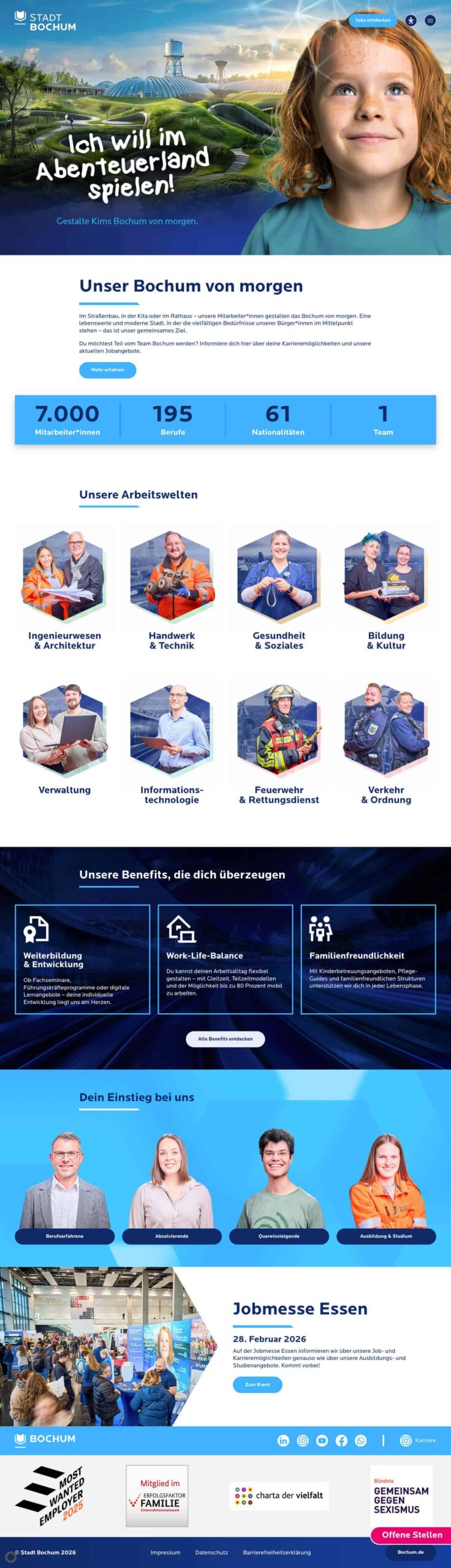 Die Stadt Bochum steht für Wandel und Gestaltungskraft – doch als Arbeitgeberin musste genau das digital erlebbar werden. Gesucht war ein Karriereportal, das Young Professionals sowie Fach- und Führungskräfte in IT, Technik, Umwelt und Soziales anspricht und zeigt: Hier wird nicht nur verwaltet, hier wird Zukunft aktiv gestaltet.