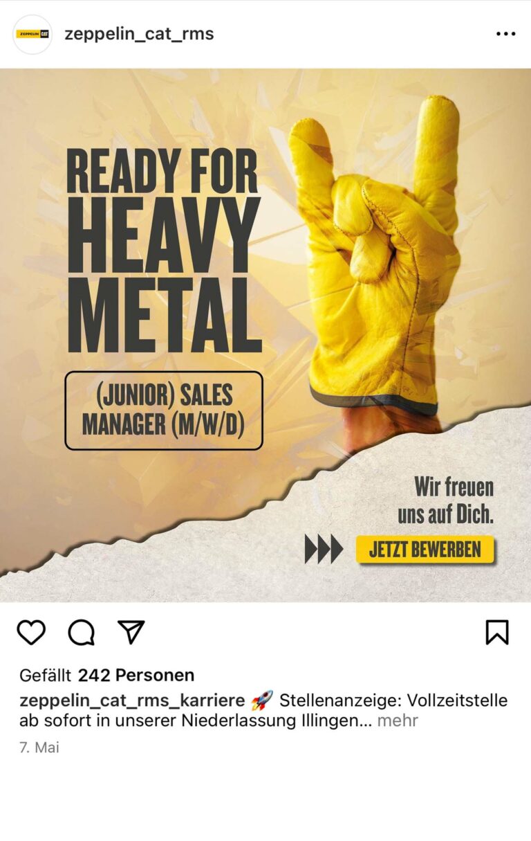 Wir organisierten einen Workshop zur Entwicklung eines zentralen Social Media Accounts für die Niederlassung Rhein-Main-Saar, der Inhalte und Aktivitäten der fünf Niederlassungen vereinen sollte. Zusätzlich wurde ein zweiter Instagram-Account für das Employer Branding speziell für Rhein-Main-Saar erstellt, um die Attraktivität von Zeppelin Caterpillar als Arbeitgeber hervorzuheben und potenzielle Mitarbeiter anzusprechen. Abgestimmte Posts wurden für beide Accounts erstellt, um eine einheitliche Präsenz und Botschaft sicherzustellen.